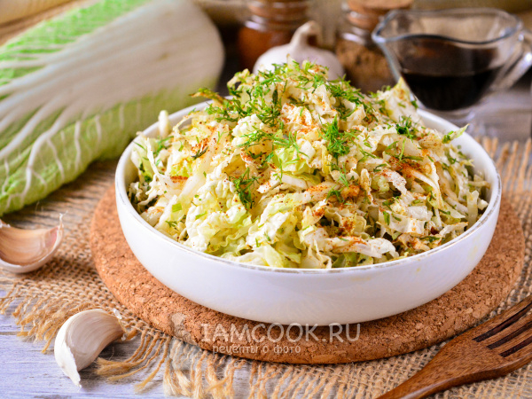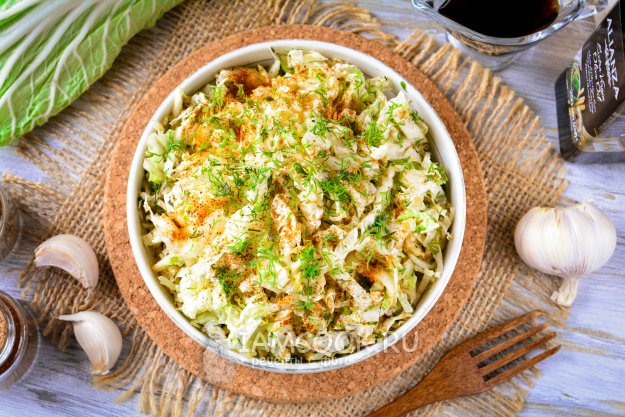 Готовый салат с пекинской капустой и чесноком подавайте к столу.