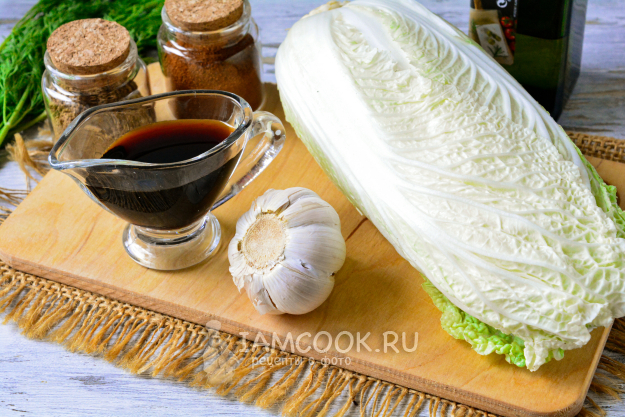 Соберите все ингредиенты для приготовления постного салата с пекинской капустой и чесноком.
