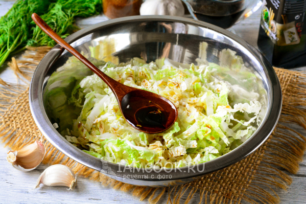 Влейте соевый соус и оливковое масло - такая заправка здесь будет очень уместной.