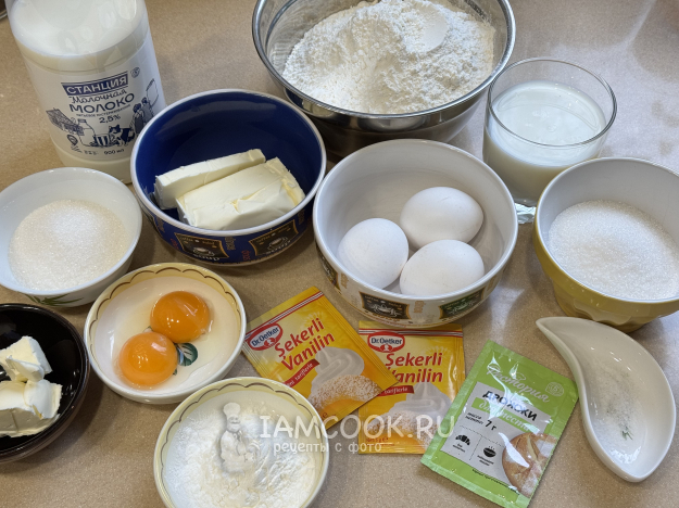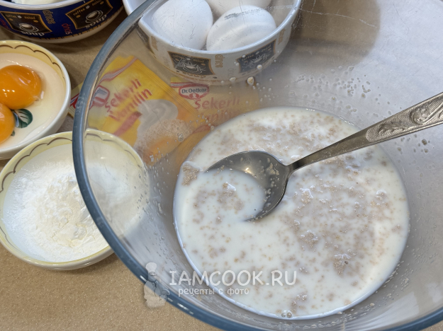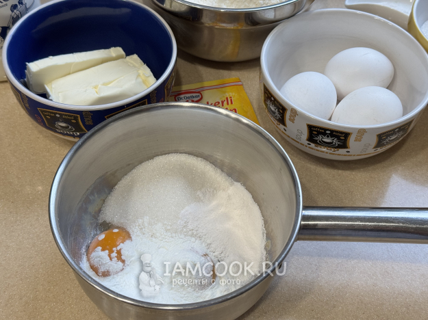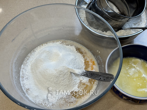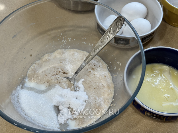 Дрожжи оживут и на поверхности молока образуется пышная шапка. Всыпать в миску сахар, соль и ванильный сахар. Масло растопить.