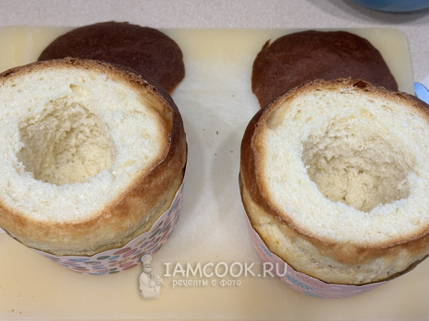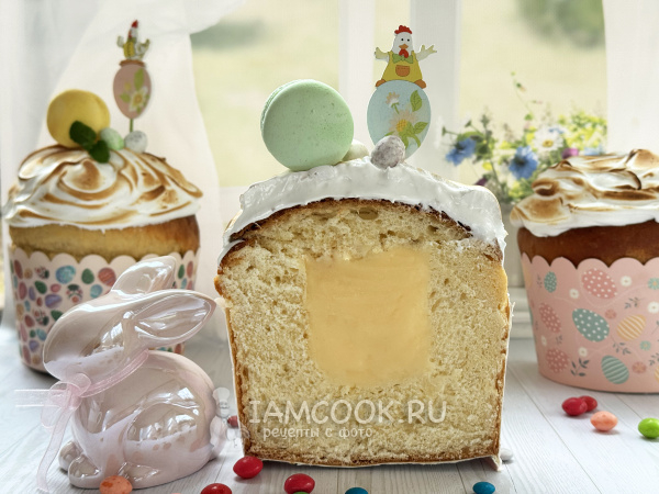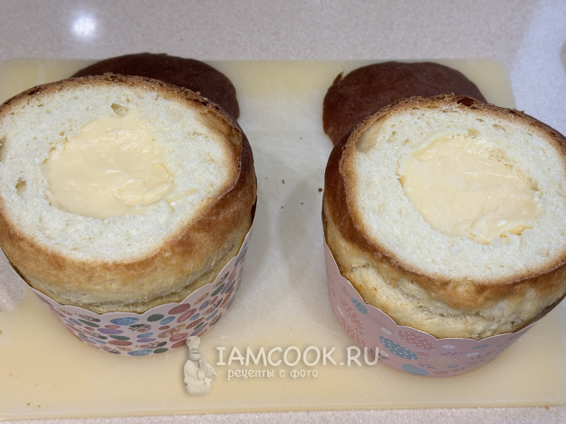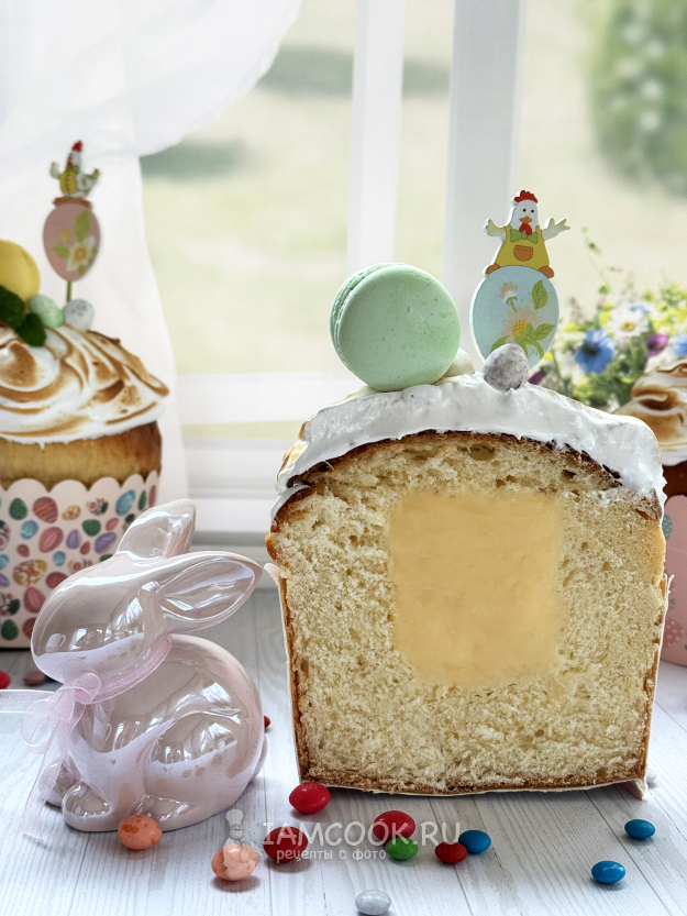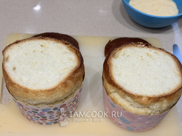 Срезать с куличей верхушки, я сформировала два больших кулича с начинкой, средний кулич оставила по классике)