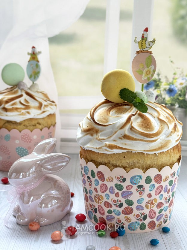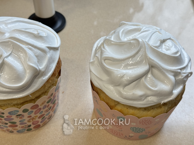 Накрыть крем верхушками. Покрыть верх кулича любой глазурью. Я покрыла белковым кремом.