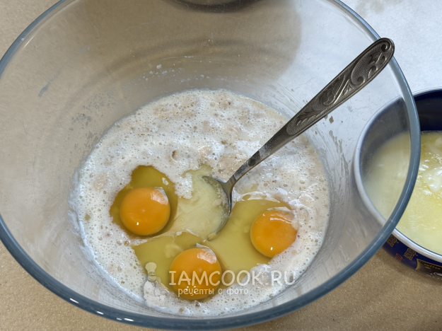 Перемешать массу ложкой, добавить яйца в миску и перемешать.