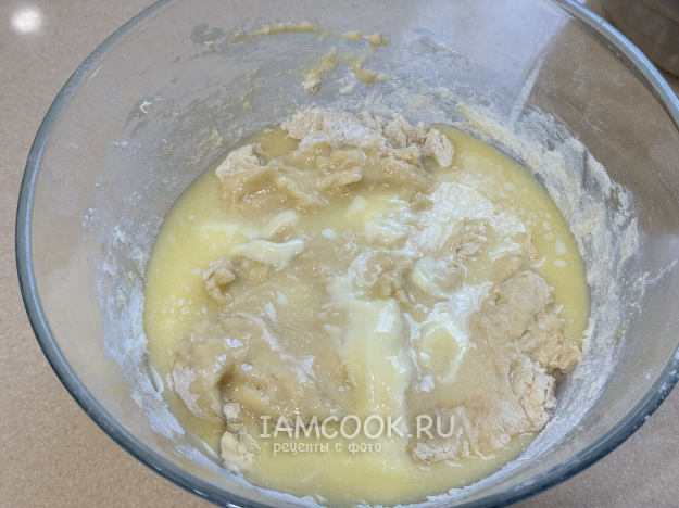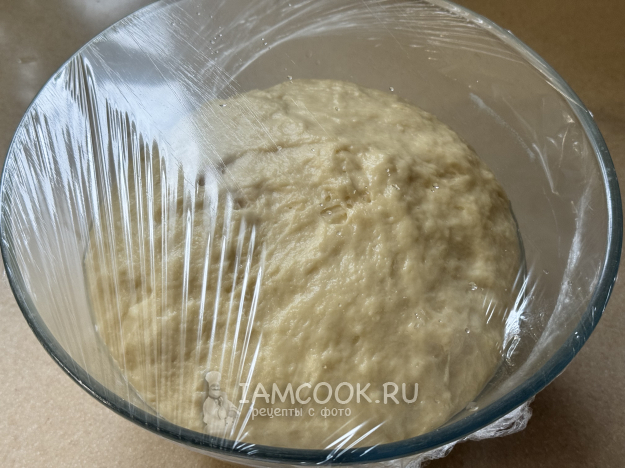 Всыпать остальную муку и вымесить тесто до гладкого состояния. Оставить тесто в миске, накрыв пищевой пленкой, и убрать в теплое место на 1,5 часа.