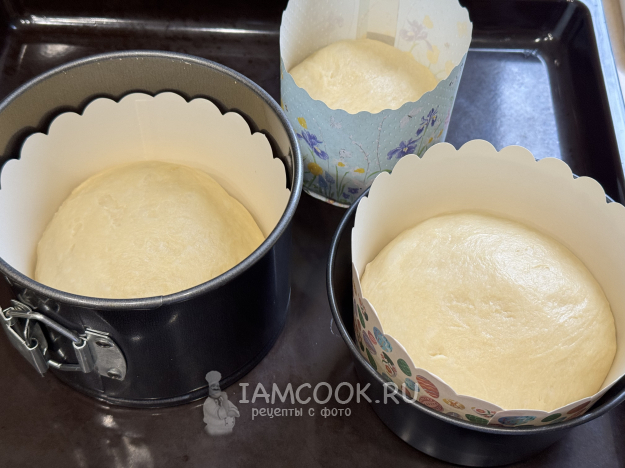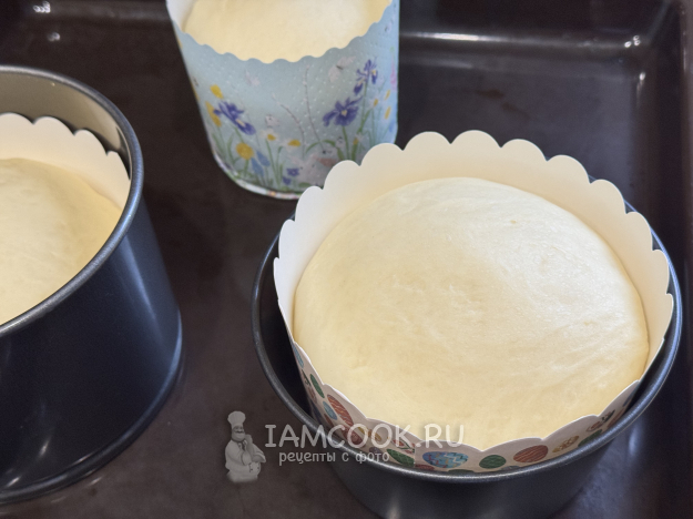 Готовое тесто обмять и дать еще подняться, примерно 35 минут. Затем обмять тесто и выложить в формы. У меня получилось два больших кулича и один средний. Оставить тесто в формах в теплом месте на 30 минут.
