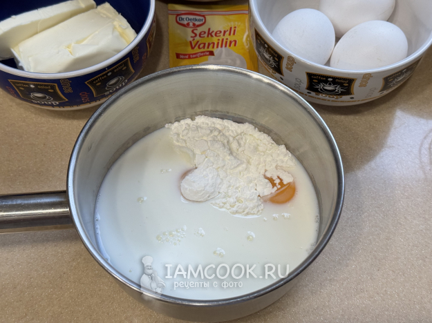 Для начала приготовить крем. В сотейник всыпать сахар, ванильный сахар, крахмал и добавить яйцо.