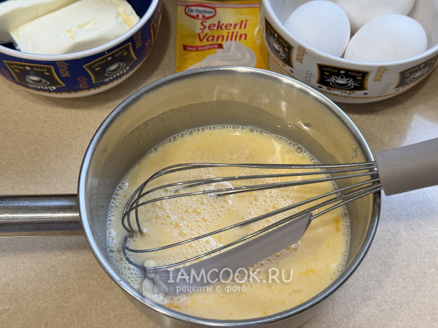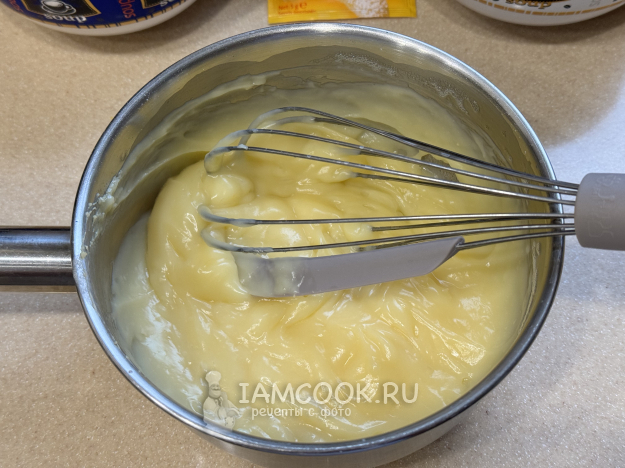 Поставить сотейник на огонь и при постоянном помешивании довести крем до загустения, на это уходит примерно 5-7 минут.