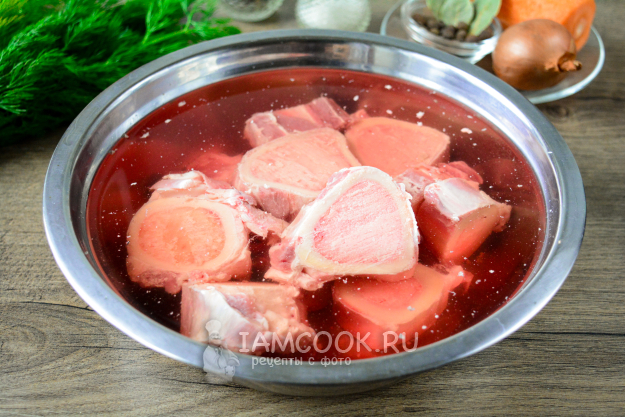 Вымачивайте кости 2-3 часа, меняя воду. Как видите из костей выходит достаточное количество крови, поэтому данный этап не пропускайте.