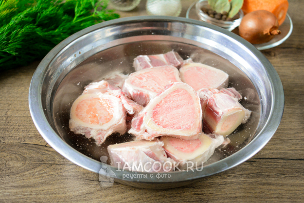 Мозговые кости промойте, сложите в глубокую миску, залейте водой.
