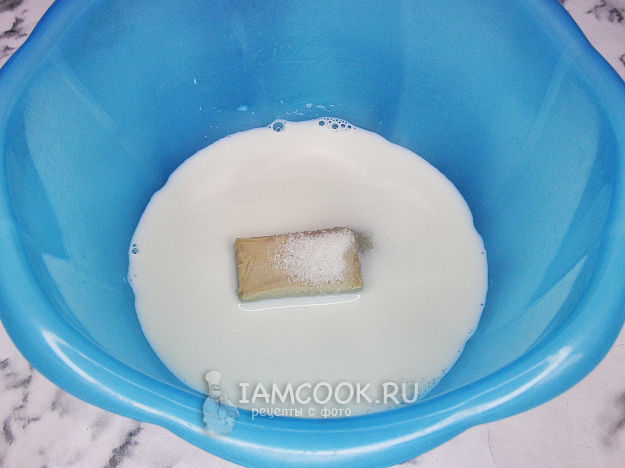 Готовим опару. Молоко разогреваем до температуры 35-36 градусов, оно должно быть тёплым, но не горячим. Кладём в молоко дрожжи, сахар и перемешиваем, пока дрожжи не растворятся.