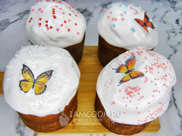 Пока «шапочка» не застыла, украшаем куличи кондитерской посыпкой или другими украшениями.