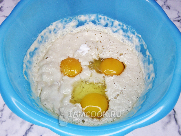 Когда опара согреется, кладём в неё два яйца и желток (белок оставим для глазури, но если вы не будете готовить белковую глазурь, то можно положить в опару три целых яйца). Добавляем немного соли и ванилин (ванильный сахар). Перемешиваем до однородного состояния.