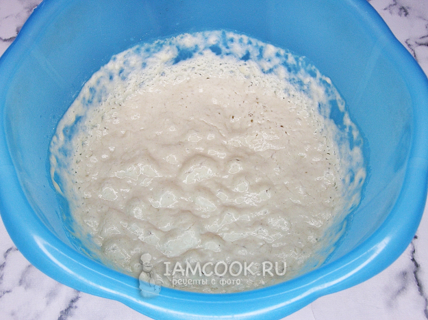 За ночь опара немного осядет, на ней появятся бугорки, а запах станет нежным, сливочным, с лёгкой винной ноткой. Достаём опару из холодильника и оставляем в тепле на 1-1,5 часа, чтобы она согрелась.