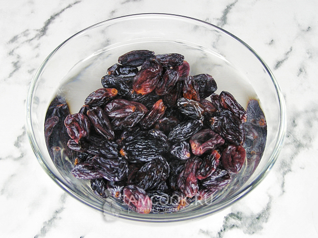 Изюм тщательно моем и, если он сухой, заливаем горячей кипячёной водой. Оставляем минут на 15-20, пока не размягчится, затем воду сливаем, изюм просушиваем на полотенце.