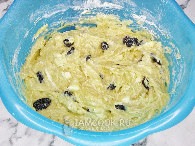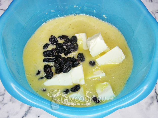 Кладём в смесь размягчённое сливочное масло и изюм.