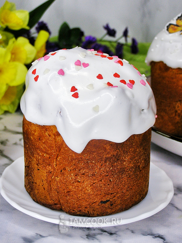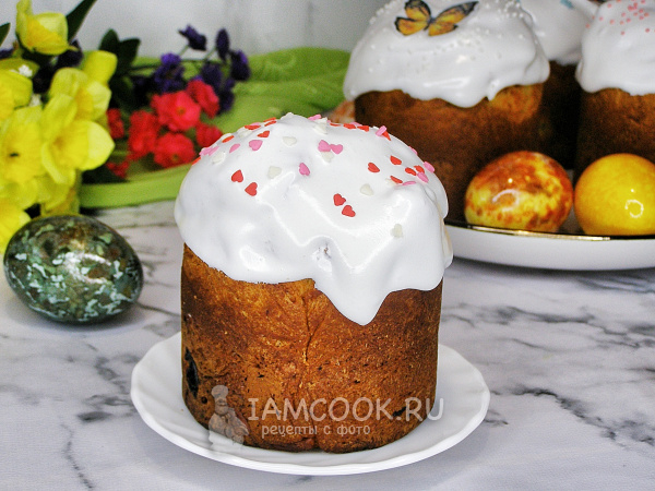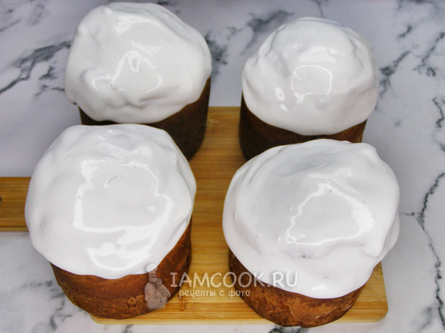 Я готовила глазурь самостоятельно - взбила миксером охлаждённый белок с сахарной пудрой и лимонным соком. По желанию можно приготовить глазурь на свой вкус или использовать готовую. Покрываем глазурью верх куличей.