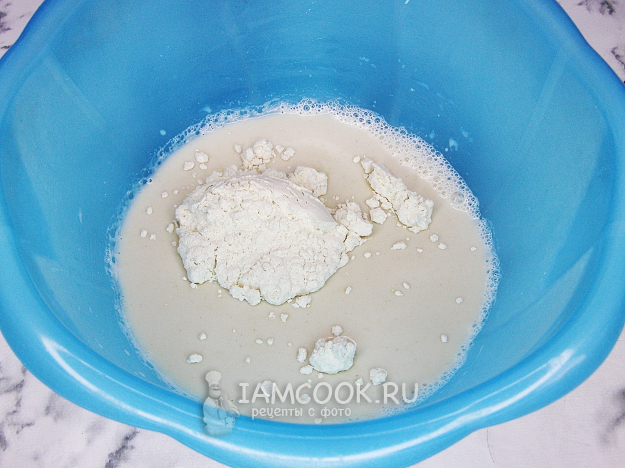 Добавляем муку и ещё раз хорошо размешиваем ложкой или венчиком, чтобы комочки муки практически полностью разошлись. По консистенции опара будет напоминать блинное тесто - слегка тягучее, но не жидкое. Оставляем опару на 20 минут в тепле.