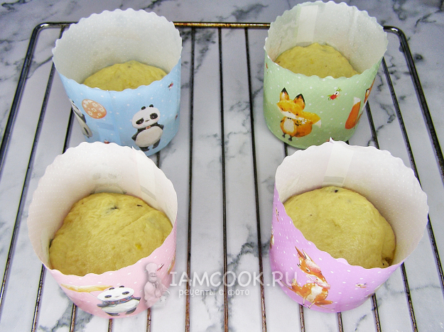 Обминаем тесто, делим на 4 части и раскладываем его по формочкам. Оставляем ещё минут на 20 для расстойки. В это время прогреваем духовку до 180 градусов.