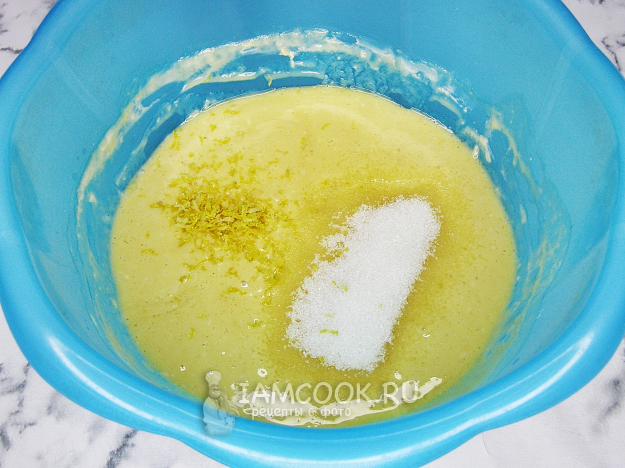 Добавляем сахар и лимонную цедру. Снова всё хорошо перемешиваем, пока сахар не растворится.