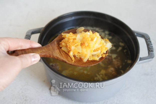 Следом - обжаренные овощи. Если любите супы погуще, на этом этапе можно добавить 1 картошку.