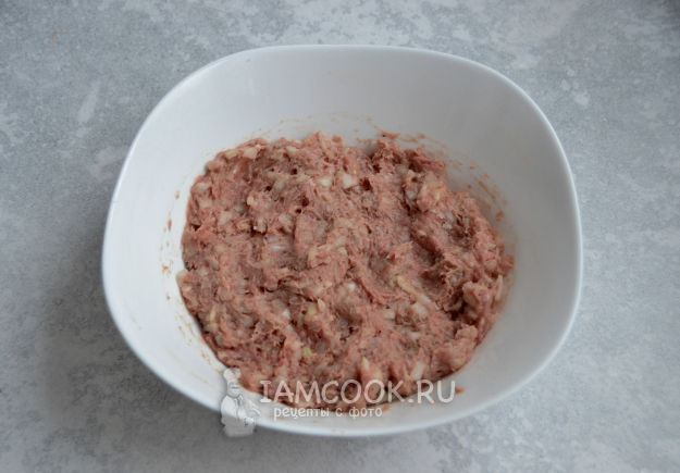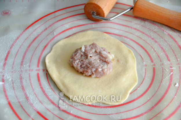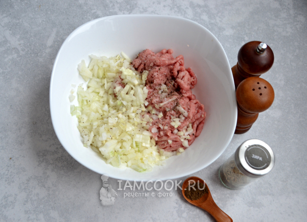 Пока тесто подходит, займитесь приготовлением начинки. Мелко нарежьте лук, добавьте его к мясному фаршу, посолите и поперчите по вкусу, добавьте молотый кориандр и зиру. Лук и мясо берутся в равных пропорциях. Если фарш слишком густой, добавьте немного воды.