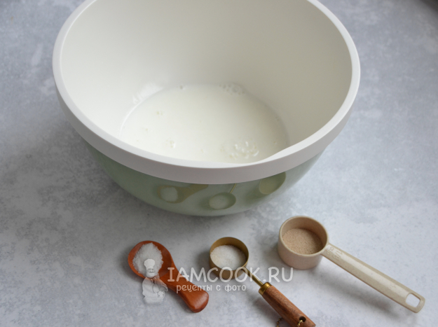 В миску для замешивания теста влейте теплое молоко и кефир, растворите сухие дрожжи, соль и сахар.
