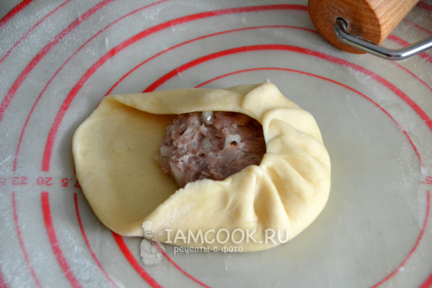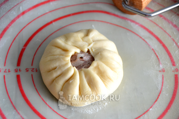 Раскатайте тесто в пласт, края сделайте потоньше, чем серединка, в центр положите начинку.