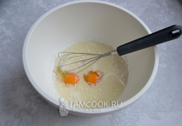 Добавьте растительное масло, вбейте 2 яйца, смешайте.