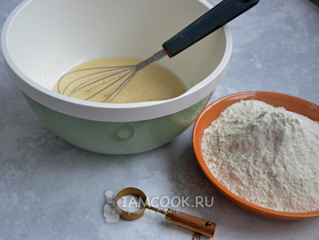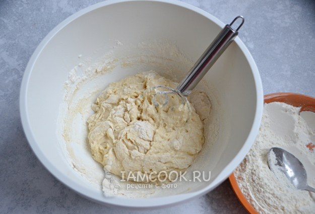 Добавьте муку с разрыхлителем. Да-да, в этом рецепте использованы и дрожжи, и разрыхлитель, вместе они сделают тесто особенно мягким и нежным.