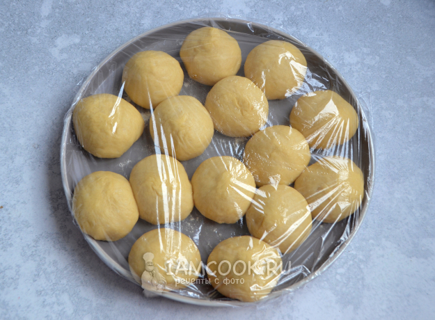 Все тесто разделите на 15 равных частей, подкатайте их в шар, накройте пленкой, дайте постоять 15-20 минут.