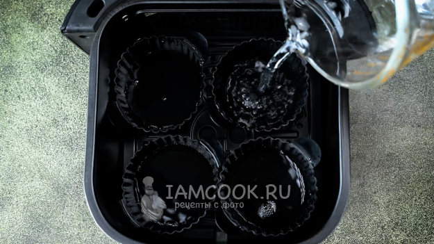 На решетку чаши аэрогриля поместите силиконовые формочки и заполните каждую наполовину водой.