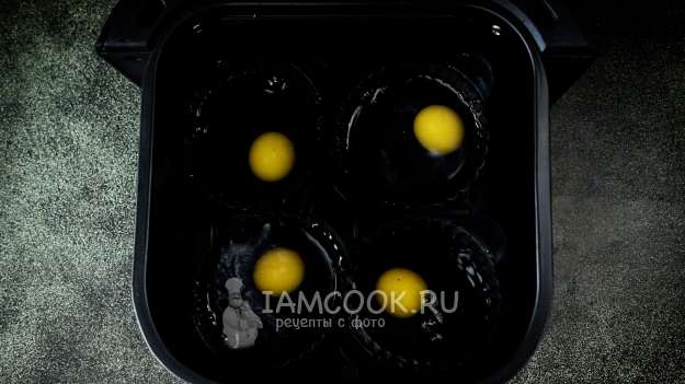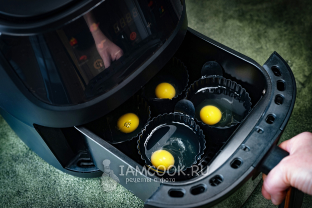 Чашу с яйцами в формочках поместите в аэрогриль.