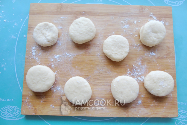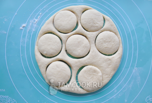Достаньте его из миски, обомните. Отрежьте часть и раскатайте в пласт толщиной 1-1,5 см. С помощью выемки диаметром 7-8 сантиметров нарежьте кружки. Так поступите со всем тестом.