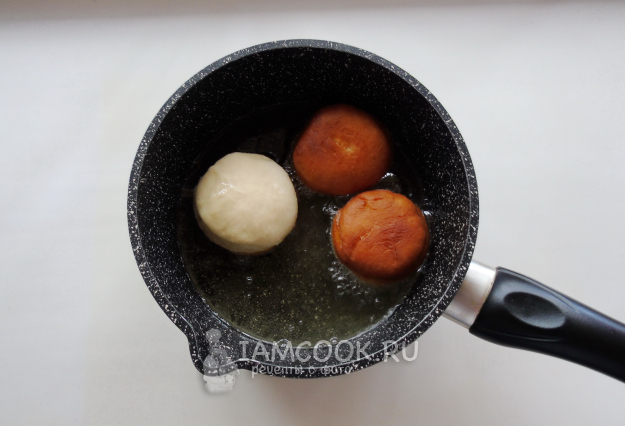 Растительное масло налейте в ковшик, кастрюлю или глубокую сковороду с толстым дном. Масло хорошо нагрейте и выложите тесто. Жарьте с обеих сторон до золотистого цвета.