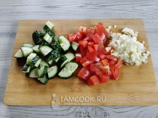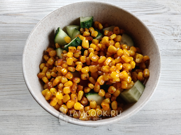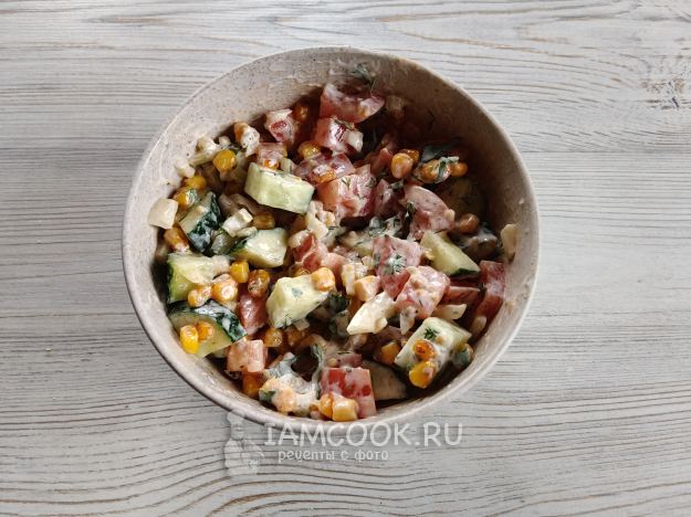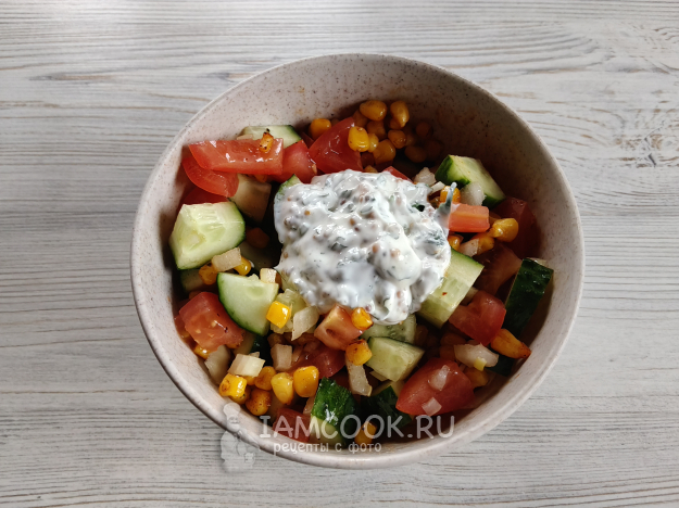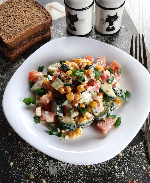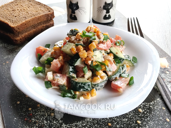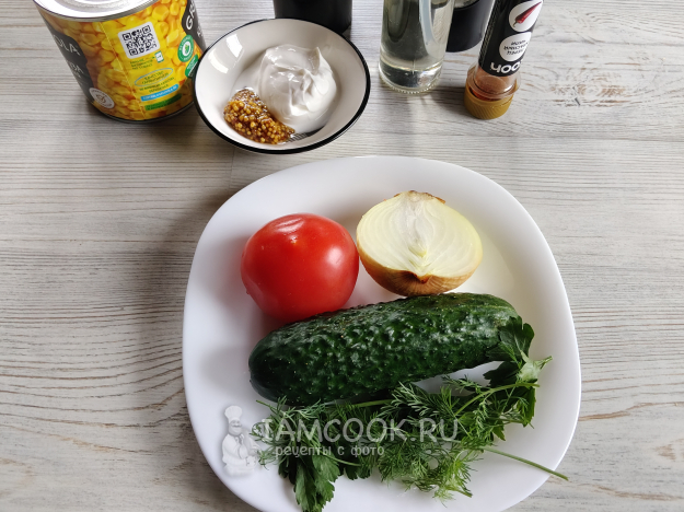 Салат с жареной кукурузой предлагаю приготовить из таких ингредиентов. Лук можно взять красный.