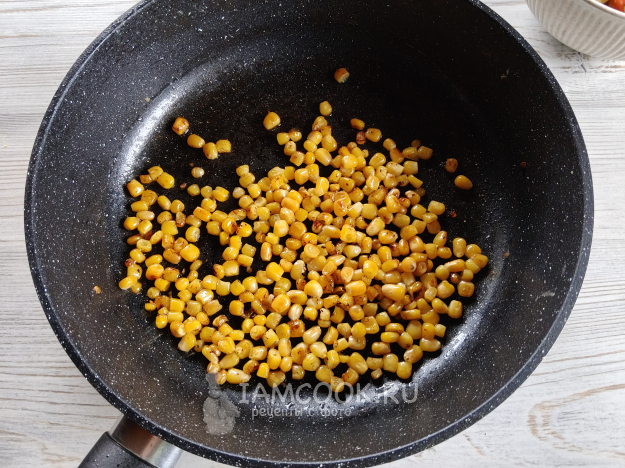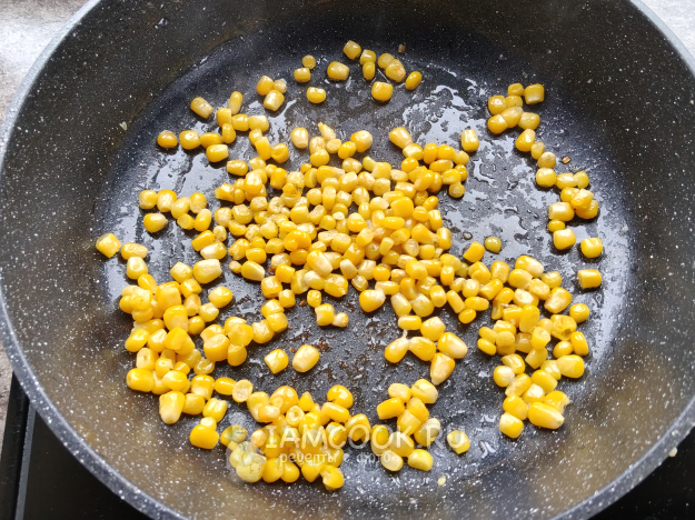 В сковороде нагреть масло, выложить кукурузу, без жидкости.