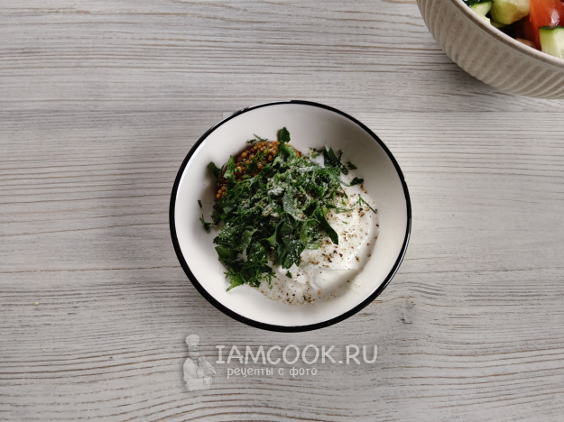 В сметану добавить нарезанную зелень, горчицу, соль и перец.