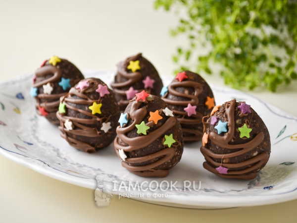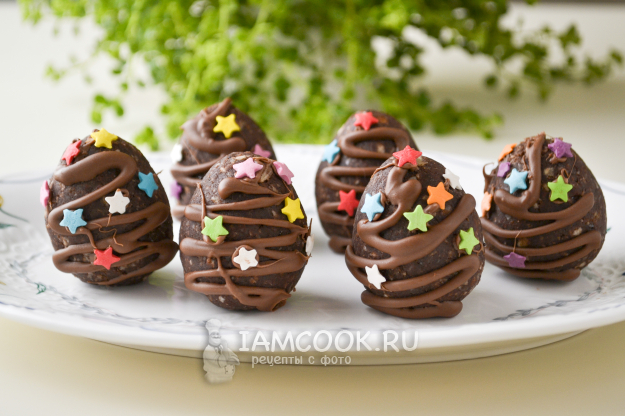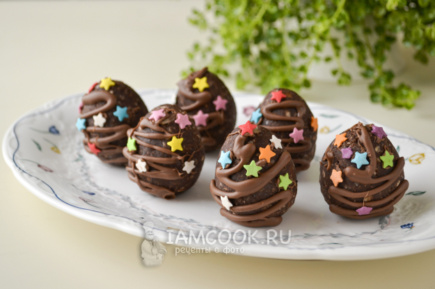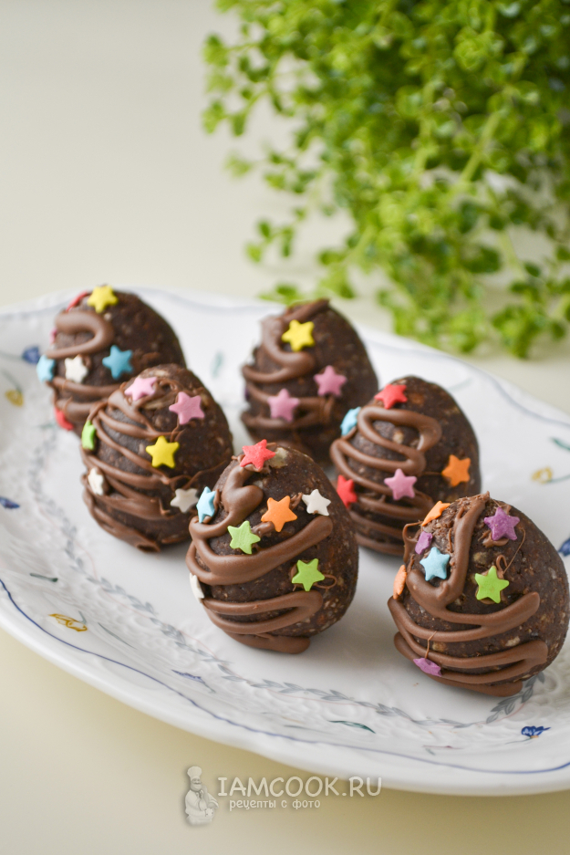 Пирожные «Картошка» на Пасху в виде яиц получились не приторными, так как слоеное печенье само по себе несладкое. Вкусный, очень простой в приготовлении десерт. На такое пирожное точно обратят внимание детки.