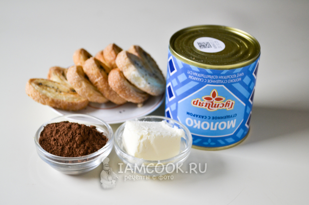 Соберите продукты для приготовления пирожного "Картошка" на Пасху в форме яиц. Я использую слоеное печенье. Сливочное масло достаньте из холодильника, чтобы стало мягким. Сгущенное молоко возьмите БЗМЖ.