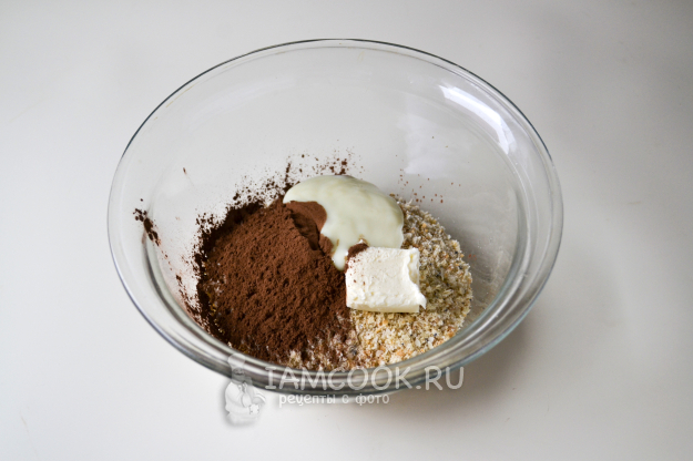 Пересыпьте измельченное печенье в миску, всыпьте какао-порошок, сливочное масло и добавьте немного сгущенного молока. Сначала перемешайте ингредиенты ложкой.