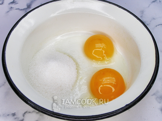 В отдельную миску выкладываем яичные желтки, добавляем сахар, перемешиваем, чтобы ингредиенты соединились. Ставим миску в кастрюлю с водой и варим на водяной бане, постоянно перемешивая, пока масса не посветлеет. Затем оставляем остывать до комнатной температуры.