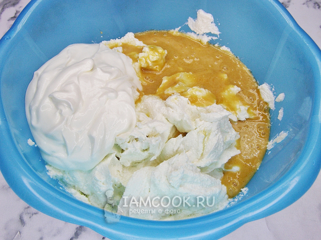 Переливаем в творог смесь мёда с желтками, добавляем сметану и снова тщательно перемешиваем, чтобы масса получилась гладкой и однородной.