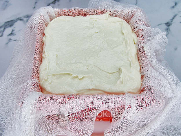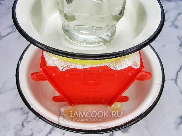 Пасочницу ставим вверх дном в глубокую миску. Внутрь кладём два-три слоя марли так, чтобы её края свисали по бокам. Выкладываем в пасочницу приготовленную творожную смесь.