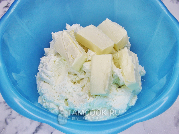 Добавляем в творог размягчённое сливочное масло и ещё раз перемешиваем.