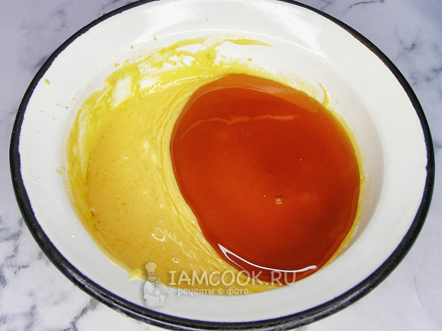В остывшую желтковую смесь добавляем мёд, хорошо перемешиваем до однородного состояния.