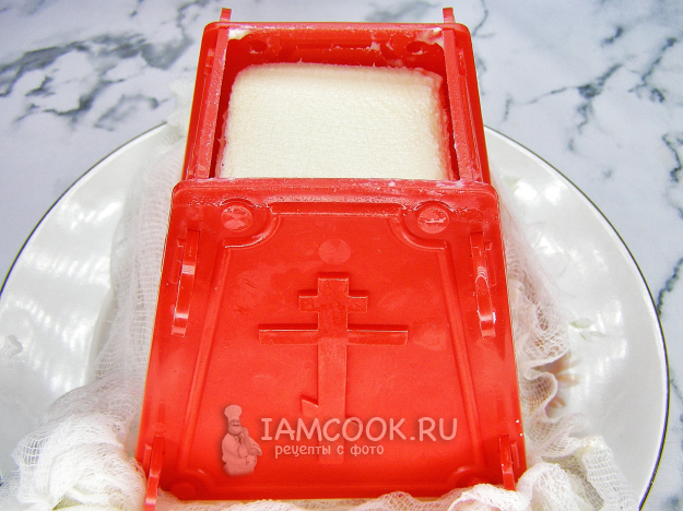 По истечении времени достаём пасху из холодильника, убираем груз и разворачиваем края марли. Сверху кладём тарелку и быстро, но аккуратно, переворачиваем. Снимаем пасочницу и убираем марлю.