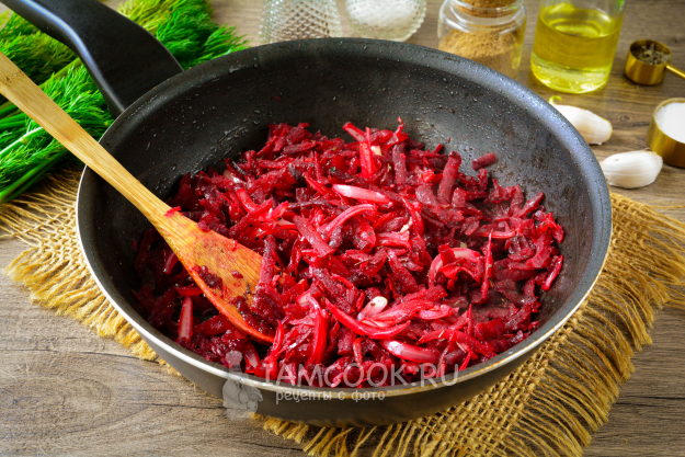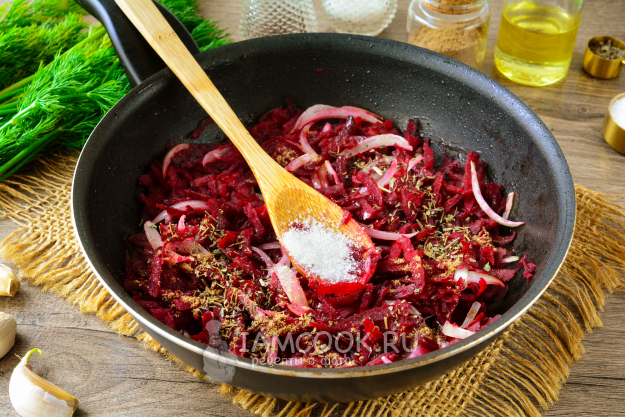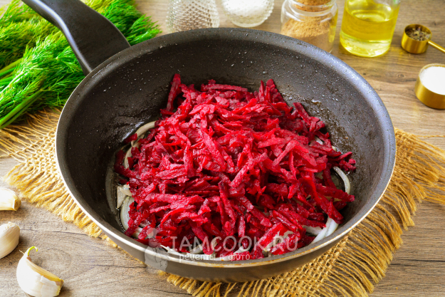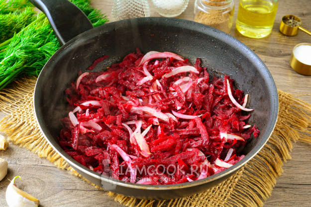 Перемешайте свеклу с луком и обжаривайте овощи пару-тройку минут на среднем огне, затем влейте немного воды и убавьте огонь на минимум, тушите 10-15 минут под крышкой.
