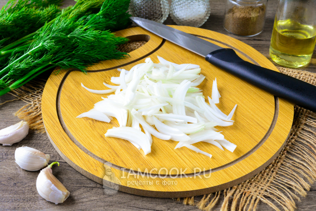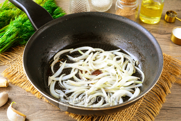 Сковороду смажьте растительным маслом, выложите лук и пассеруйте на небольшом огне 1-1,5 минуты.