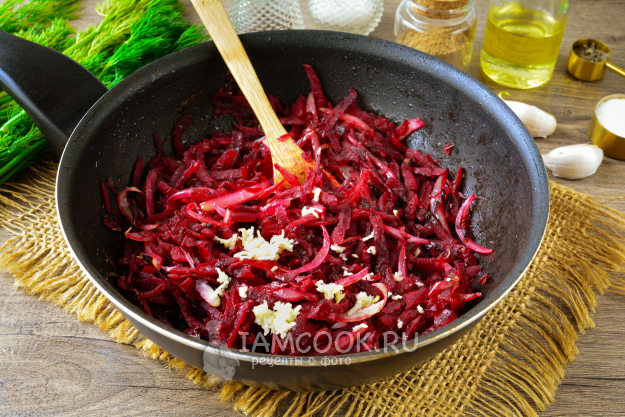 В конце добавьте к тушеной свекле чеснок, выдавленный через пресс. Перемешайте и тушите еще 3-5 минут на медленном огне под крышкой.