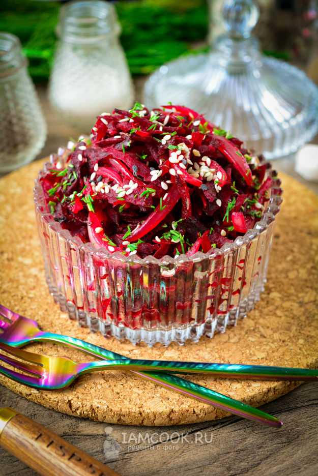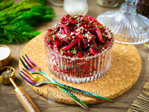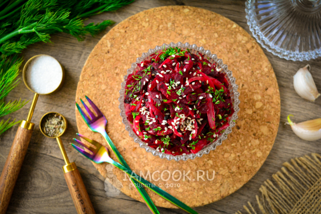 Тушеная свекла с луком и чесноком готова, пусть немного остынет, затем блюдо подавайте к столу.